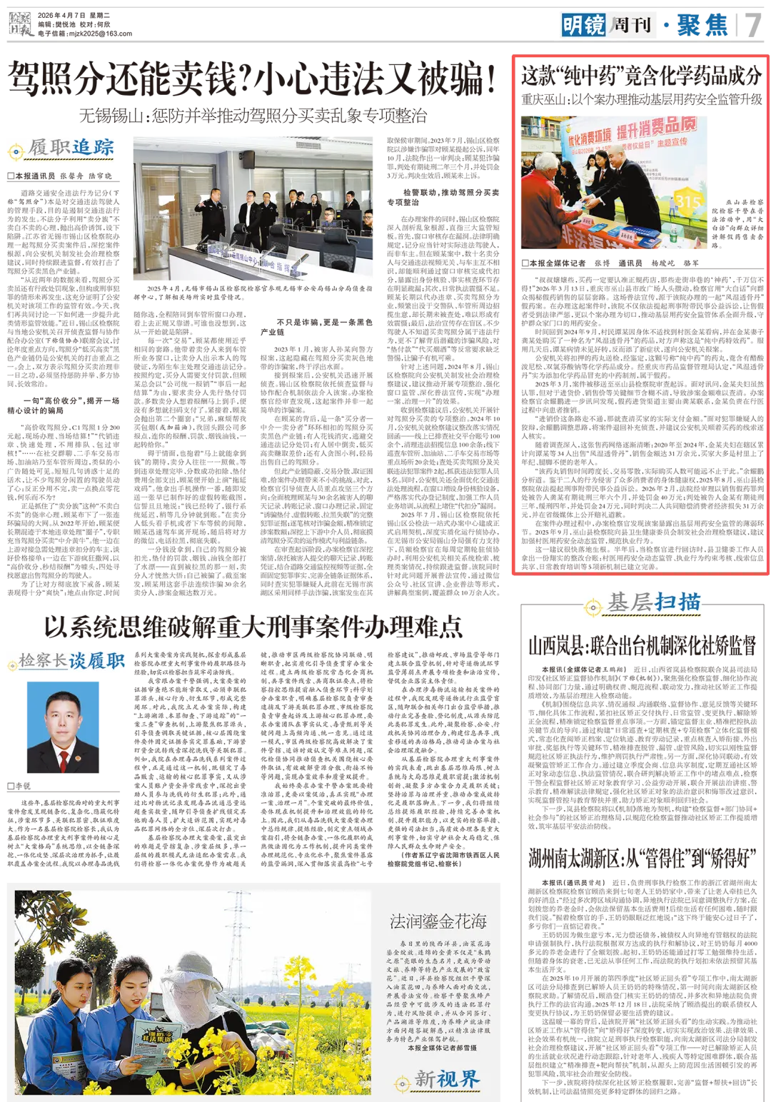 2026年4月7日,《检察日报》第7版刊登《这款“纯中药”竟含化学药品成分——重庆巫山:以个案办理推动基层用药安全监管升级》一文,内容如下: