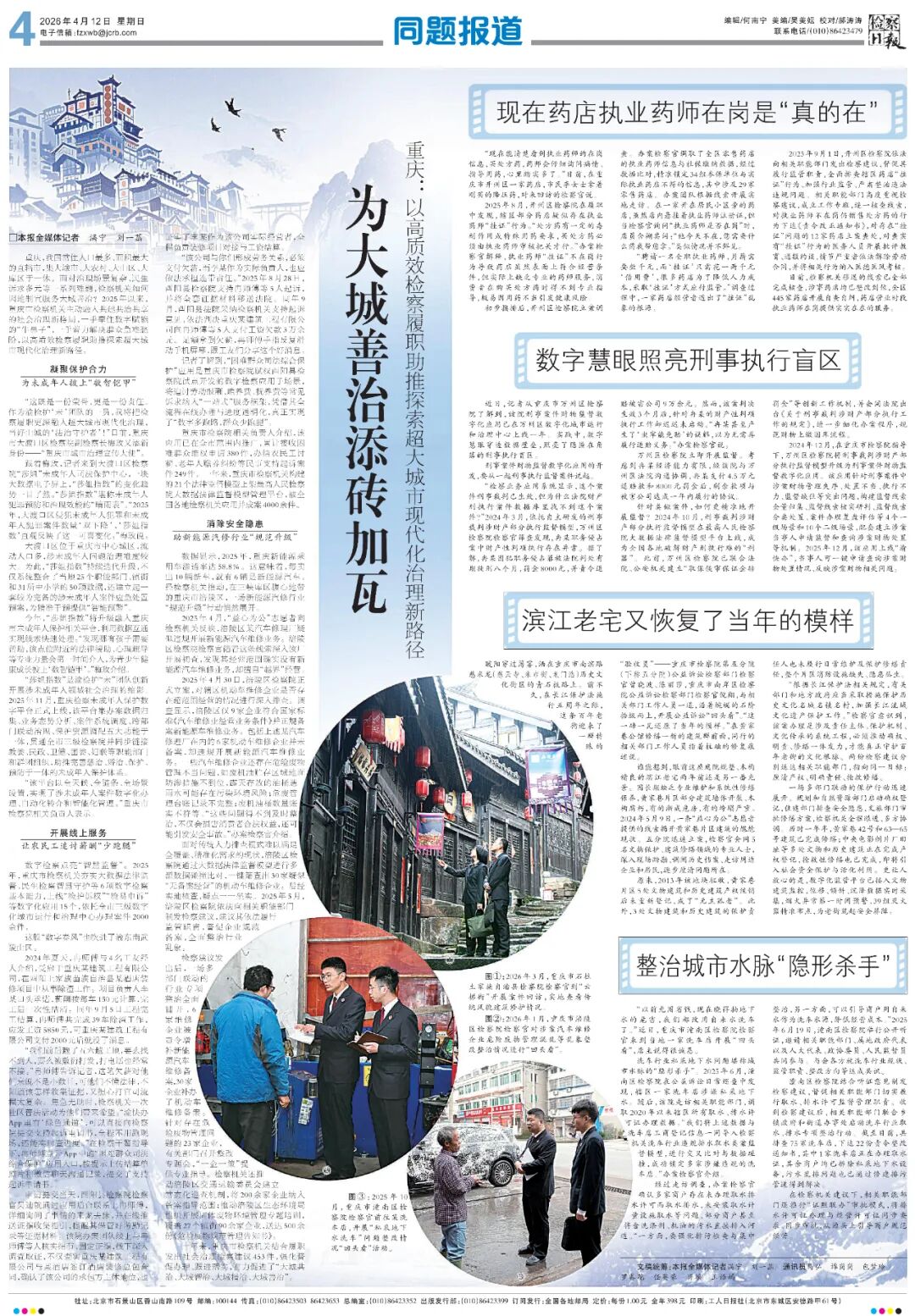 2026年4月12日,《检察日报》第4版整版刊登《为大城善治添砖加瓦——重庆:以高质效检察履职助推探索超大城市现代化治理新路径》一文,内容如下: