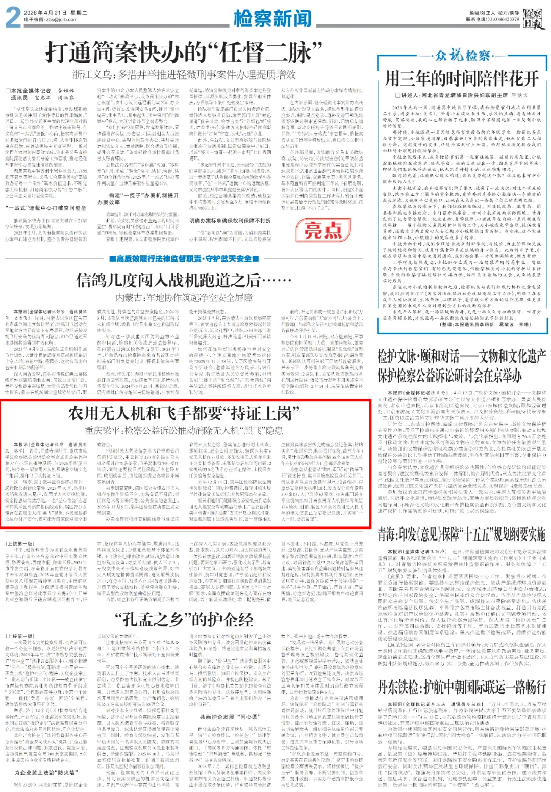 2026年4月21日,《检察日报》第2版刊登《农用无人机和飞手都要“持证上岗”——重庆梁平:检察公益诉讼推动消除无人机“黑飞”隐患》一文,内容如下: