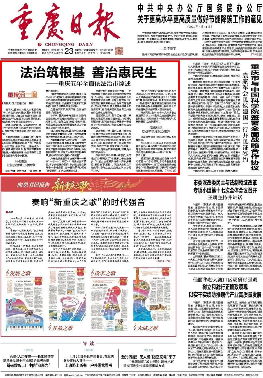 2026年4月23日,《重庆日报》头版头条转第3版刊登《法治筑根基 善治惠民生——重庆五年全面依法治市综述》一文,其中,对重庆检察机关五年来在数字检察、未成年人综合司法保护等方面的经验做法和突出成效进行报道,主要内容如下: