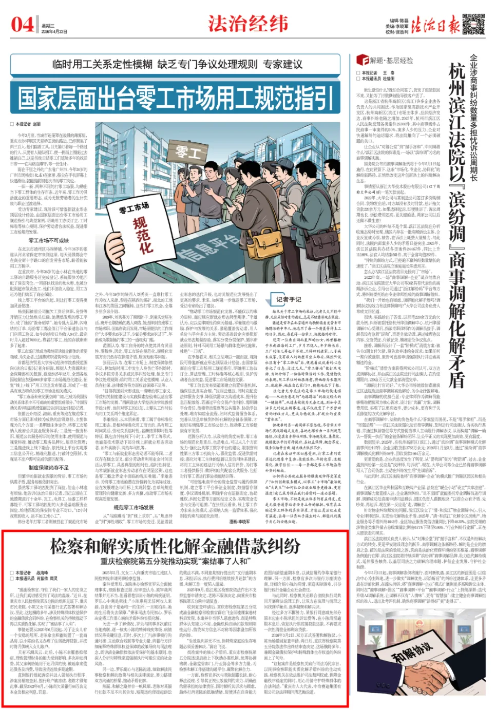 2026年4月22日,《法治日报》第4版刊登《检察和解实质性化解金融借款纠纷——重庆检察院第五分院推动实现“案结事了人和”》一文,内容如下: