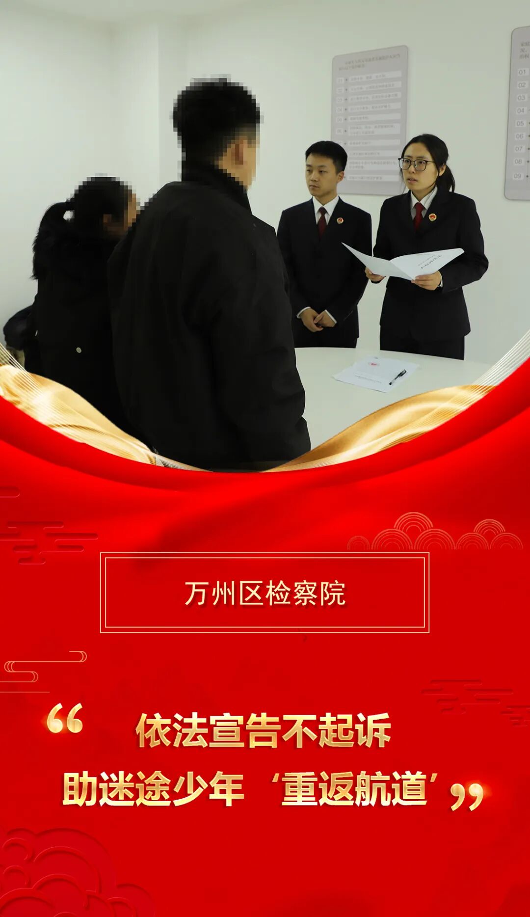 春节后上班伊始,万州区检察院未检部门的干警便迅速投入工作。在一起涉罪未成年人案件中,办案团队秉持“教育、感化、挽救”理念,依法开展不起诉宣布工作,并结合案情严肃进行法治训诫,既讲清行为的违法性与社会危害,又耐心倾听成长困惑、疏导心理情绪,在传递司法善意的同时,为迷途少年点亮回归之路。新的一年,未检团队将持续以专业与温情守护未成年人健康成长,用扎实履职筑牢司法保护防线。