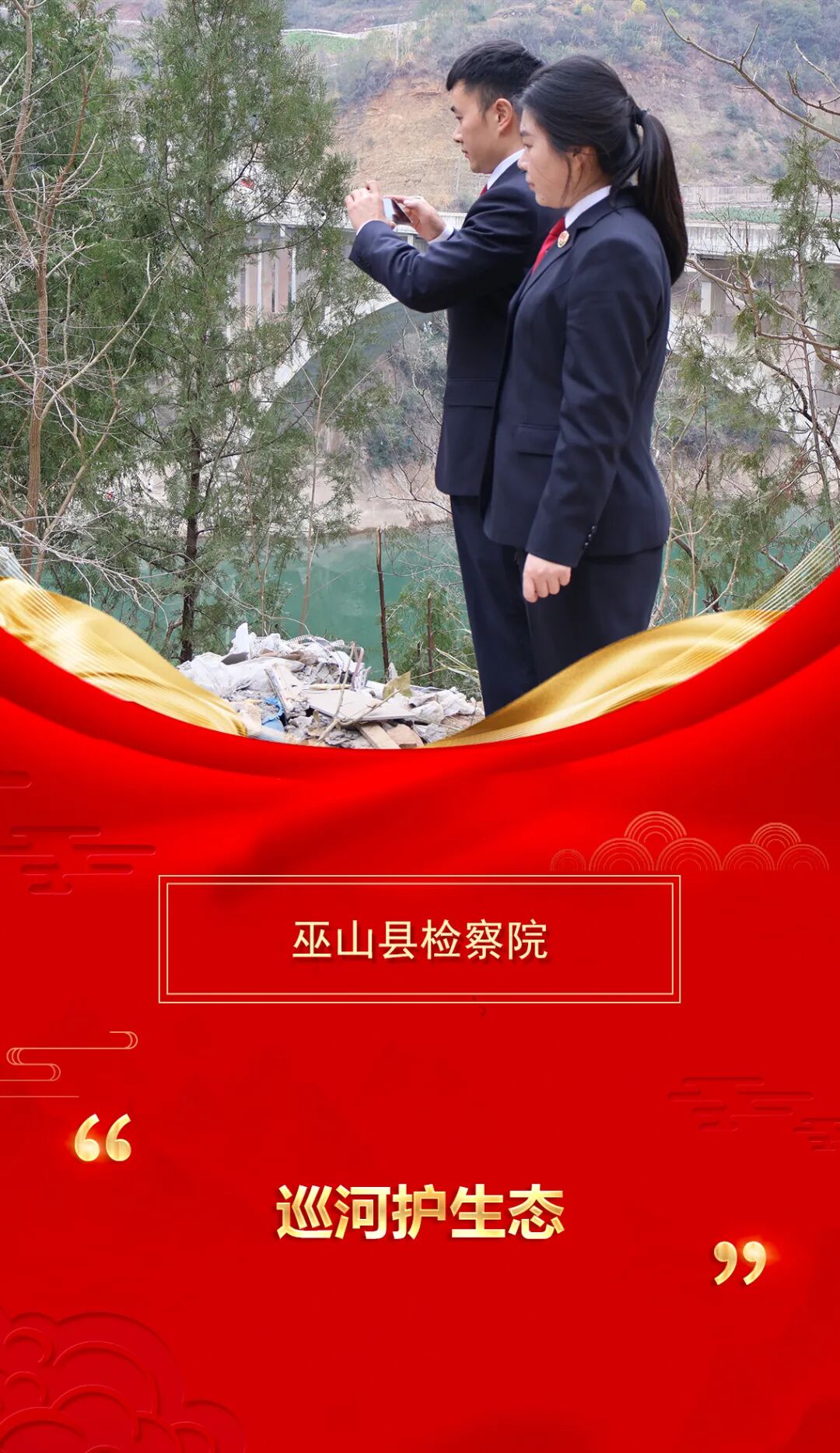 “你看,这里堆满了建筑垃圾。”节后开工第一天,巫山县检察院公益诉讼检察干警在巡查巫峡镇沿岸河流时,被眼前的景象拦住了脚步。各类建筑垃圾与生活垃圾混杂堆积,不仅侵占了河岸线,更与碧波绿水格格不入。检察干警立即上前查看并拍照取证。针对这一情况,我院公益诉讼部门将以“开局即冲刺”的干劲,精准履行公益诉讼监督职责,联合相关行政部门第一时间开展专项整治,确保问题整改无死角,以扎实行动为新年第一天开工起好头、迈好步。