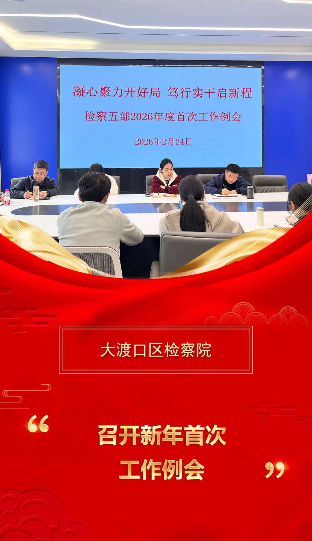 2月24日上午,大渡口区检察院检察五部召开2026年度首次工作例会,全面总结去年工作,明确新一年重点任务和推进方向。会议紧扣最高检及全市、全院工作要点,深入分析当前工作难点,系统梳理目标任务与落实路径,以更高标准、更实举措推动未成年人检察、公益诉讼检察、长江生态检察工作提质升级。参会人员围绕岗位职责,就机制创新、品牌打造、能力提升等交流思路、细化举措,为新一年工作开好局、起好步奠定坚实基础。