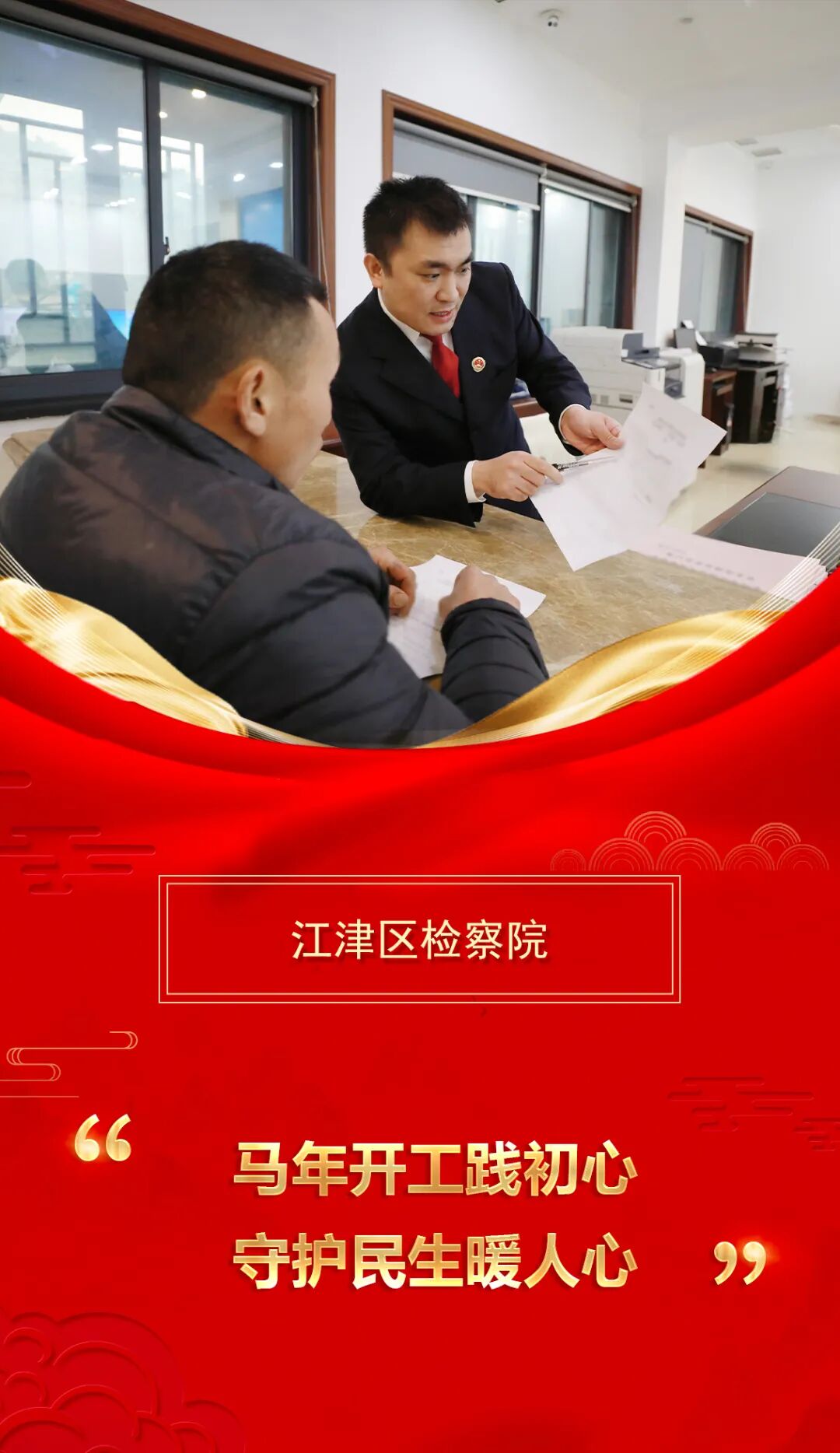 马启新程,实干为要。开工伊始,江津区检察院全体检察干警迅速收心归位,以实干担当开启新年新程。在12309检察服务中心接待室,检察官第一时间对接节前办结的赡养纠纷案当事人,在送达民事调解书的同时,立足法律法规细致释法说理,将法理、情理与事理有机融合,让司法既有力度更具温度。以“开局即冲刺”的昂扬姿态,把司法温情融入民生实事,用专业履职践行检察使命,以实干实绩守护群众切身福祉,展现新年检察新气象、新作为。