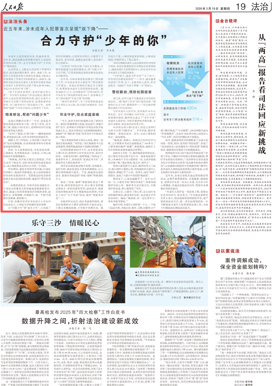 2026年3月19日,《人民日报》第19版“法治头版”专栏刊登《合力守护“少年的你”》一文,其中对荣昌区检察院用司法守护弥合家庭裂痕的事迹进行了报道,内容如下: