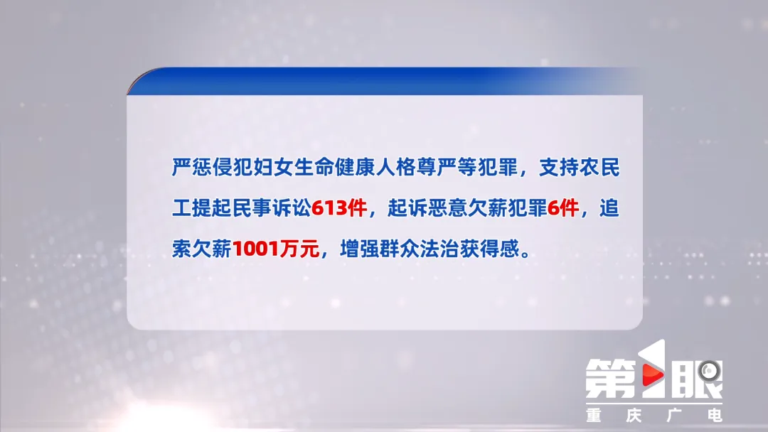 2025年,重庆检察机关严惩侵犯妇女生命健康、人格尊严等犯罪,支持农民工提起民事诉讼613件,起诉恶意欠薪犯罪6件,追索欠薪1001万元,增强群众法治获得感;全力守护老百姓“舌尖上”的安全,起诉假冒伪劣食品药品犯罪152人;办理生态环境和资源保护公益诉讼案件1028件,提起公益诉讼87件,守护“一江碧水、两岸青山”;深入推进司法救助,坚持应救尽救、应救即救。